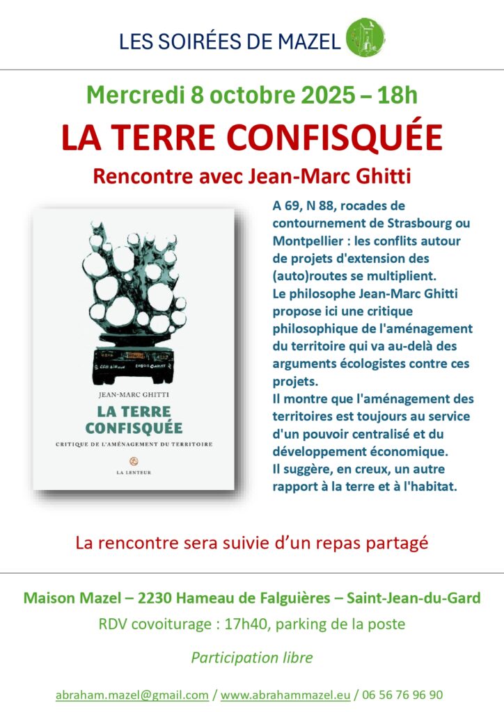 Rencontre avec le philosophe Jean-Marc Ghitti qui présentera son livre « La terre confisquée », une critique de l’aménagement du territoire qui va au-delà des arguments écologiques contre les projets d’aménagement.